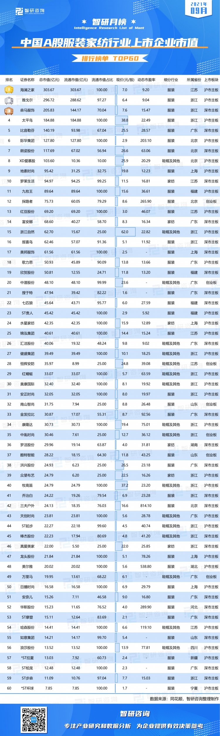 服裝家紡行業共有60家企業已上市,總市值共計3351.24億元,流通市值共計2652.28億元。