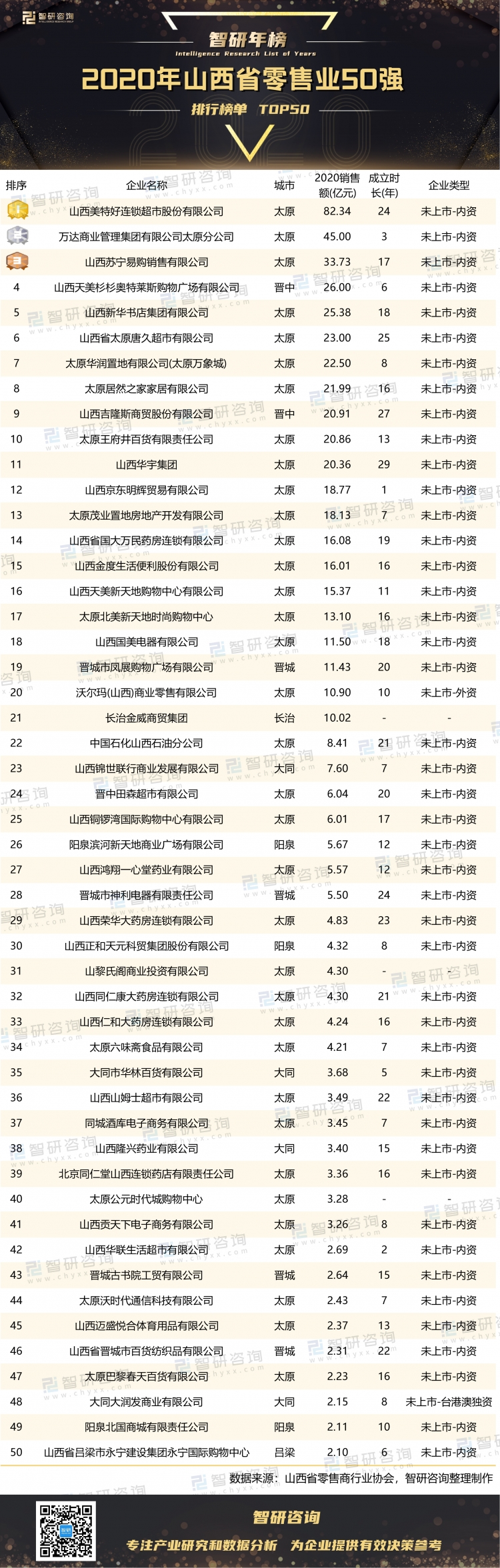 近日,山西省零售商行業協會發布山西省2020年度零售業50強公示名單,智研咨詢數據中心據此推出《智研年榜:2020年山西省零售業50強排行榜單TOP50》,以供參考。
