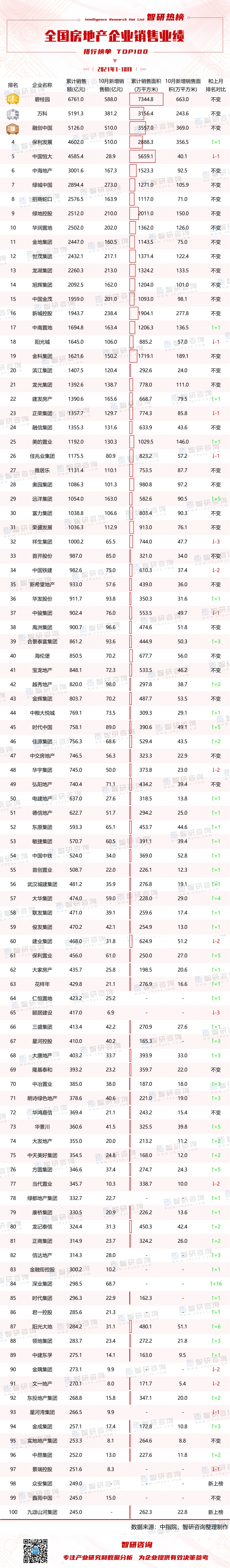 上榜的100家企業2021年1-10月銷售額累計10.68萬億元,較上月百強累計銷售額增加0.83萬億元,入圍門檻也由上月的229.8億元提高6.61%升至245億元,銷售面積累計7.02億平方米;百家企業10月新增銷售額共計8904.8億元,新增銷售面積共計5994.9萬平方米。