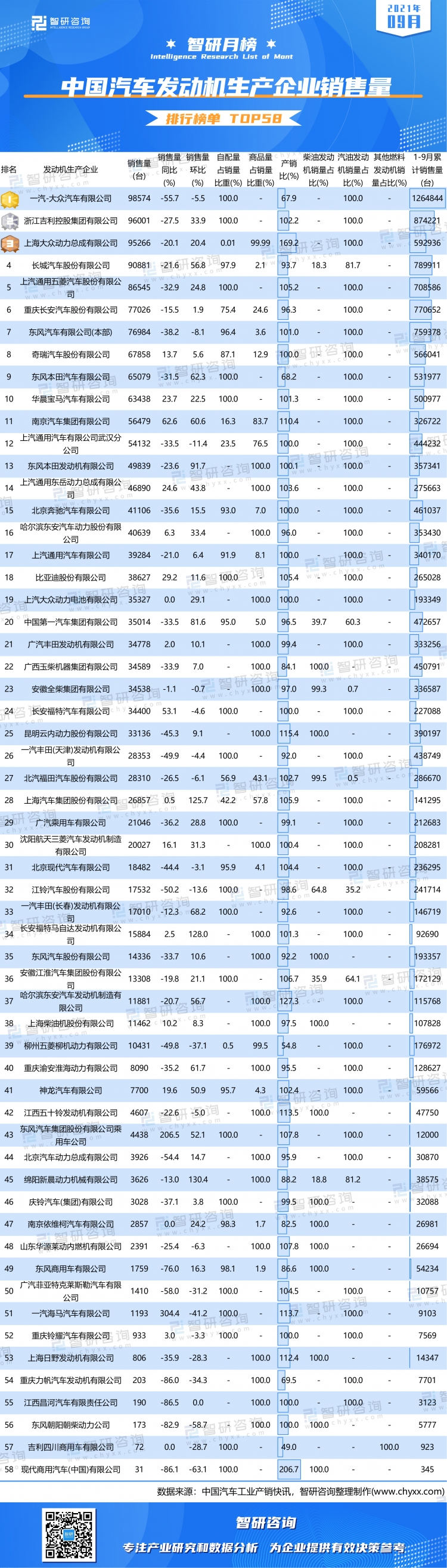 為研究中國發動機生產企業對應發動機的銷售詳情,智研咨詢數據中心推出《智研月榜:2021年9月中國汽車發動機生產企業銷售量排行榜單TOP58》,以供參考。
