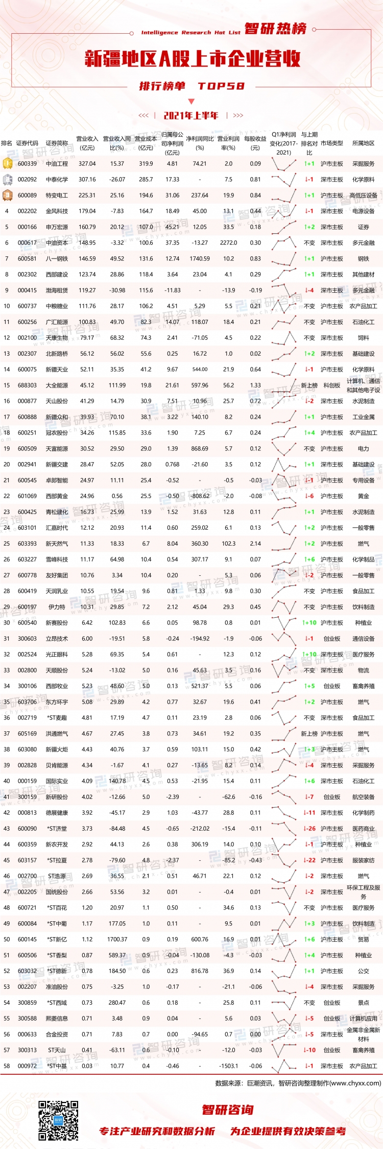 2021年上半年新疆地區上市企業TOP58榜單中,中油工程營收為327.04億元,同比上升了15.37%,占整個新疆地區營收的12.69%;上市企業營收同比中,有45家上市企業營收同比有所上升,13家上市企業營收同比有所下降,*ST新億營收同比增長最多(1700.37%),*ST濟堂營收同比下降最多(84.48%);與上期排名相比,11家上市企業排名不變,23家上市企業排名有所上升,22家上市企業排名有所下降,光正眼科排名上升最多,上升了10位,*ST濟堂排名下降最多,下降了26位,大全能源、洪通燃氣這2家新上榜。