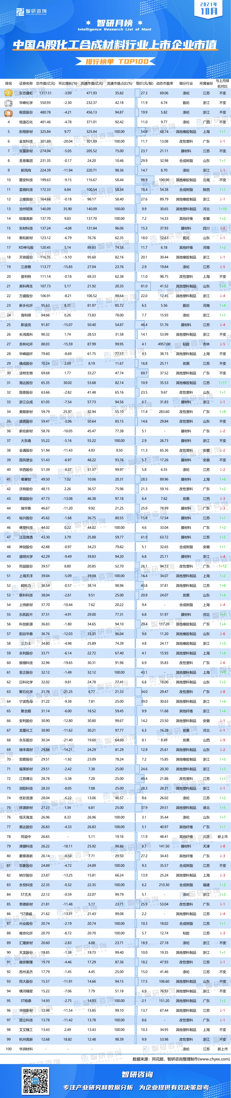 與9月A股化工合成材料行業(yè)上市企業(yè)總市值排名相比,10月有42家企業(yè)排名上升,改性塑料企業(yè)同益股份升幅最大,排名提高12個名次升至第50,海達股份、滄州明珠均提高不少于10個名次;35家企業(yè)排名下滑,永東股份降幅最大,排名下降9個名次跌至第68;包括前4強企業(yè)在內(nèi)的21家企業(yè)排名不變;同益中(10月19日上市)、華潤材料(10月26日上市)2家企業(yè)為10月新上市企業(yè),其中華潤材料10月數(shù)據(jù)暫未統(tǒng)計,其發(fā)行總市值為23.19億元,發(fā)行價為10.45元/股;宏昌電子(SH603002)在10月被歸類至電子化學品行業(yè)。