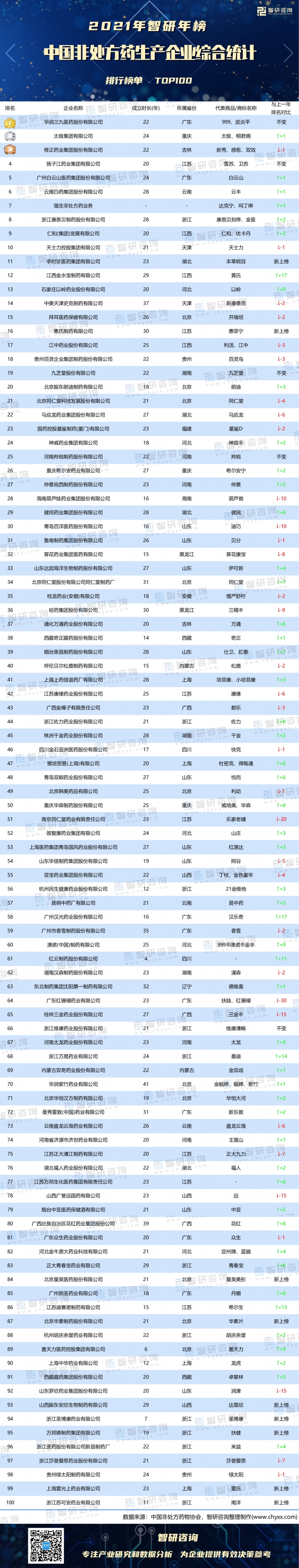 100家企業中,華潤紫竹藥業有限公司成立時間最長,已成立41年,此外還有8家企業成立時長不少于30年,其中中美天津史克制藥有限公司排名最高,排名第14,浙江圣博康藥業有限公司、蓋天力醫藥控股集團有限公司、紅云制藥股份有限公司3家企業成立時長不足10年。