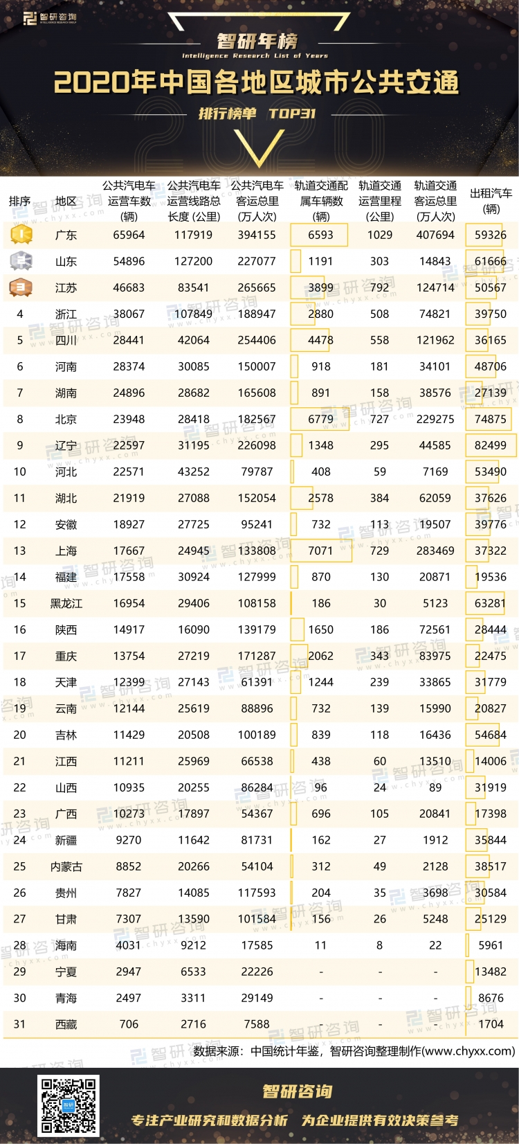 依據(jù)榜單可知:1)23個地區(qū)公共汽電車運營車輛數(shù)超過萬輛,廣東最高,有65964輛公共汽電車在運營,比公共汽電車運營車輛數(shù)第二名的山東多出了11068輛公共汽電車;2)從軌道交通配屬車輛數(shù)來看,12個地區(qū)超過千輛,上海、北京、廣東以超過6千輛的軌道交通配屬車輛數(shù)排名前三,山西、海南不足百輛,寧夏、青海、西藏暫無軌道交通車輛;3)從各地區(qū)的出租汽車數(shù)量來看,8個地區(qū)城市出租汽車數(shù)量超過5萬輛,特別是遼寧、北京、黑龍江、山東,其出租汽車數(shù)量最多,青海、海南、西藏這3個地區(qū)城市出租汽車數(shù)量不足萬輛。
