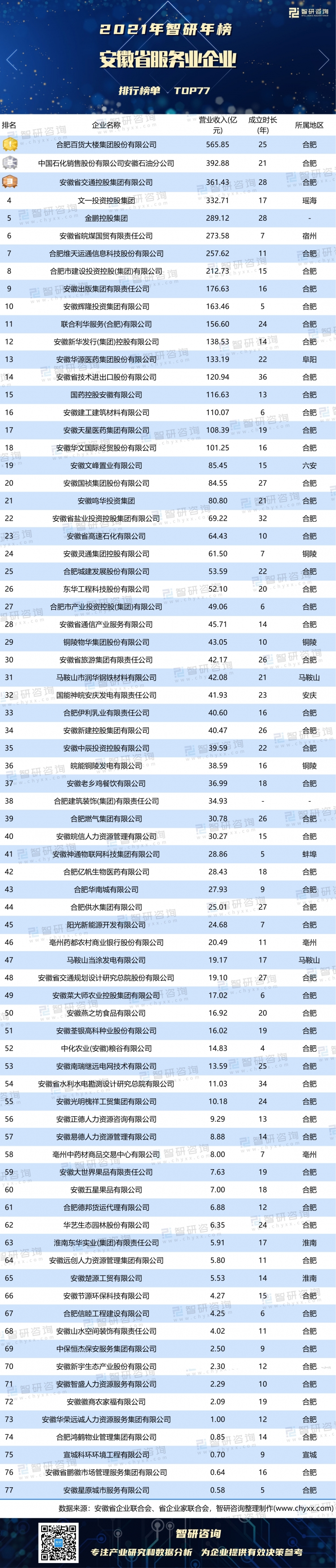 安徽省企業(yè)聯(lián)合會(huì)、省企業(yè)家聯(lián)合會(huì)發(fā)布了2021安徽省服務(wù)業(yè)企業(yè)榜單,榜單以安徽企業(yè)2020營(yíng)業(yè)收入為依據(jù)進(jìn)行排序。榜單企業(yè)有23家入圍安徽百?gòu)?qiáng)企業(yè)名單,且榜單企業(yè)總營(yíng)收約為5509.52億元。