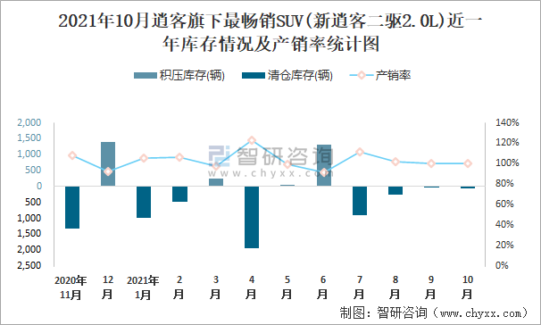 2021年10月逍客旗下最暢銷SUV(新逍客二驅(qū)2.0L)近一年庫存情況及產(chǎn)銷率統(tǒng)計圖