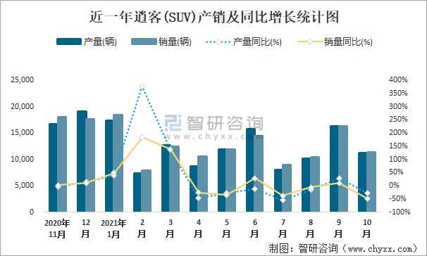 近一年逍客(SUV)產(chǎn)銷及同比增長統(tǒng)計圖