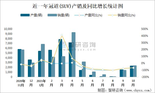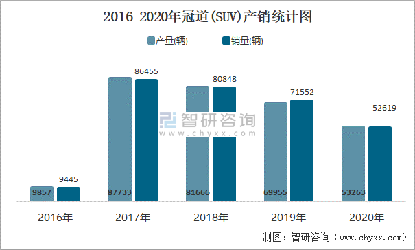 根據中國汽車工業協會數據可知:2021年10月冠道(SUV)產量為2304輛,同比下降63.4%,銷量為2358輛,同比下降64.4%,當月產銷率為102.34%;2021年1-10月冠道(SUV)累計產量為31673輛,同比下降27.9%,累計銷量為33087輛,同比下降24.8%,累計產銷率為104.46%;2016-2020年冠道(SUV)產銷量均在2017年達到最高值,此后逐年遞減,且近5年總產量大于總銷量,積壓了庫存1555輛。