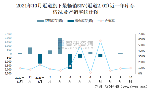2021年10月冠道旗下最暢銷SUV(冠道2.0T)近一年庫存情況及產銷率統計圖