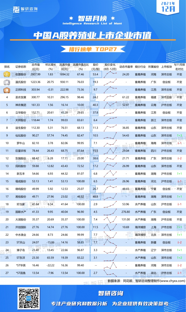 為研究中國養殖業上市企業股票市值,智研咨詢數據中心推出《智研月榜:2021年12月中國A股養殖業上市企業市值排行榜單TOP27》,以供參考。