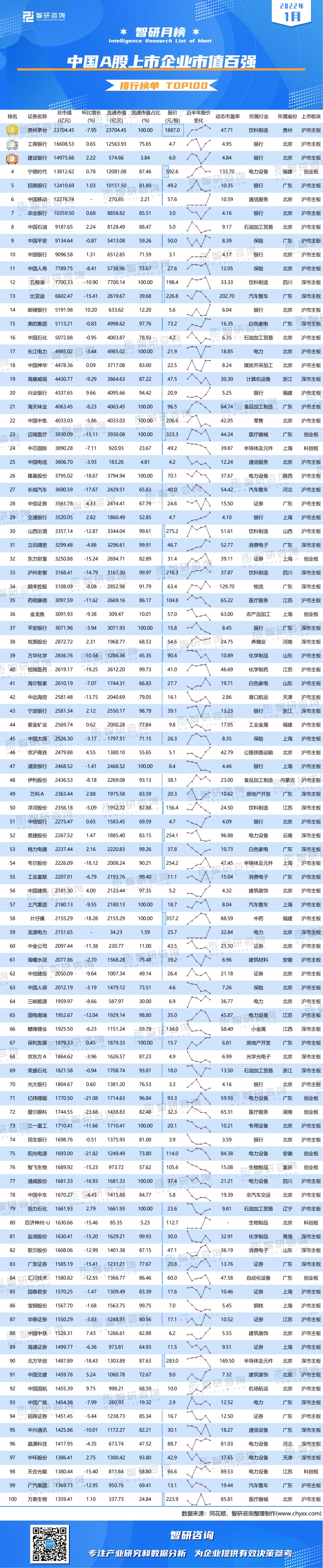 為研究中國A股上市企業股票市值,智研咨詢數據中心推出《智研月榜:2022年1月中國A股上市企業市值百強排行榜單TOP100》,以供參考。