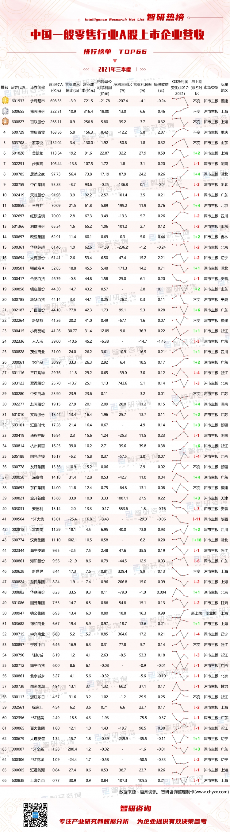 依據(jù)榜單可知,永輝超市營收約為698.4億元,營收同比下降3.9%,占整個(gè)一般零售行業(yè)上市企業(yè)總營收的21.17%,豫園股份、百聯(lián)股份、重慶百貨、家家悅再度蟬聯(lián)榜單前5。52家企業(yè)營收同比呈現(xiàn)不同程度增長,漢商集團(tuán)同比增長幅度最大(602.1%),14家企業(yè)營收同比有所下滑,*ST大集下降幅度最大(25.4%)。就榜單營收與2020年三季度排名變化情況來看,22家企業(yè)排名有所上升,漢商集團(tuán)上升了18名(最大),30家企業(yè)排名有所下降,*ST大集從30名下降到了41名,下降名次最多,13家企業(yè)排名未發(fā)生變化,德必集團(tuán)這1家企業(yè)新上榜。