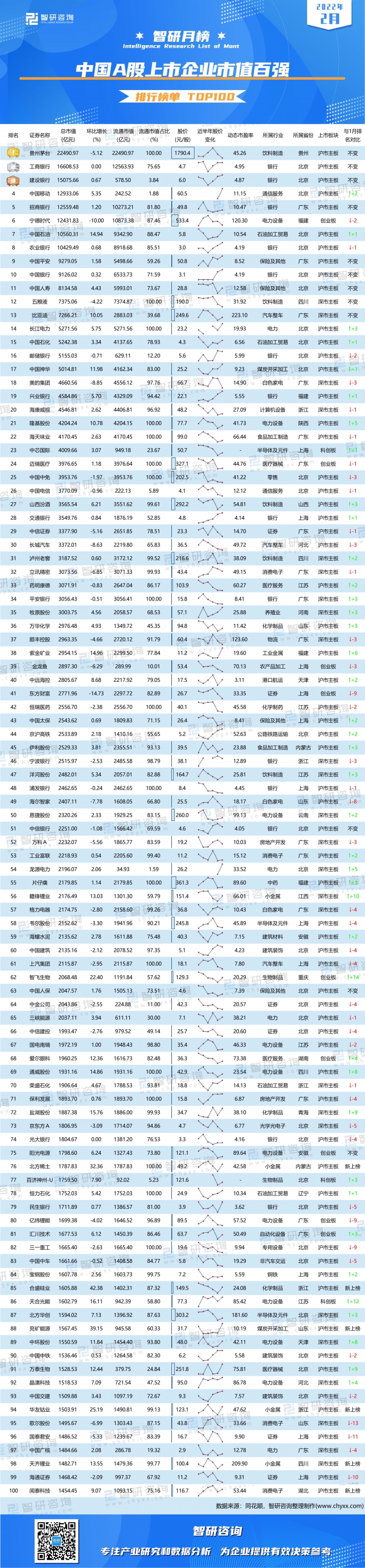 相較于2022年1月百強排名,12家企業排名不變,其中6家為前10強企業;40家企業排名上升,智飛生物升幅最大,提高14個名次升至第62;42家企業排名下滑,歌爾股份降幅最大,下降13個名次跌至第95;廣汽集團、招商證券、中興通訊、中國國航、華泰證券、廣發證券6家企業排名跌出百強,其中3家企業從事證券行業;北方稀土、合盛硅業、兗礦能源、聞泰科技、天齊鋰業、華友鈷業6家企業新上榜,其中3家企業從事小金屬行業,6家企業中北方稀土總市值最高,為1787.83億元,排名第76。